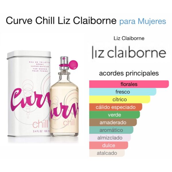 El Curve Chill de Liz Claiborne es una fragancia refrescante y vibrante para mujeres. Fue lanzada en 2006 y creada por Laurent Le Guernec, Loc Dong y Jean-Marc Chaillan. Aquí están las notas principales:
